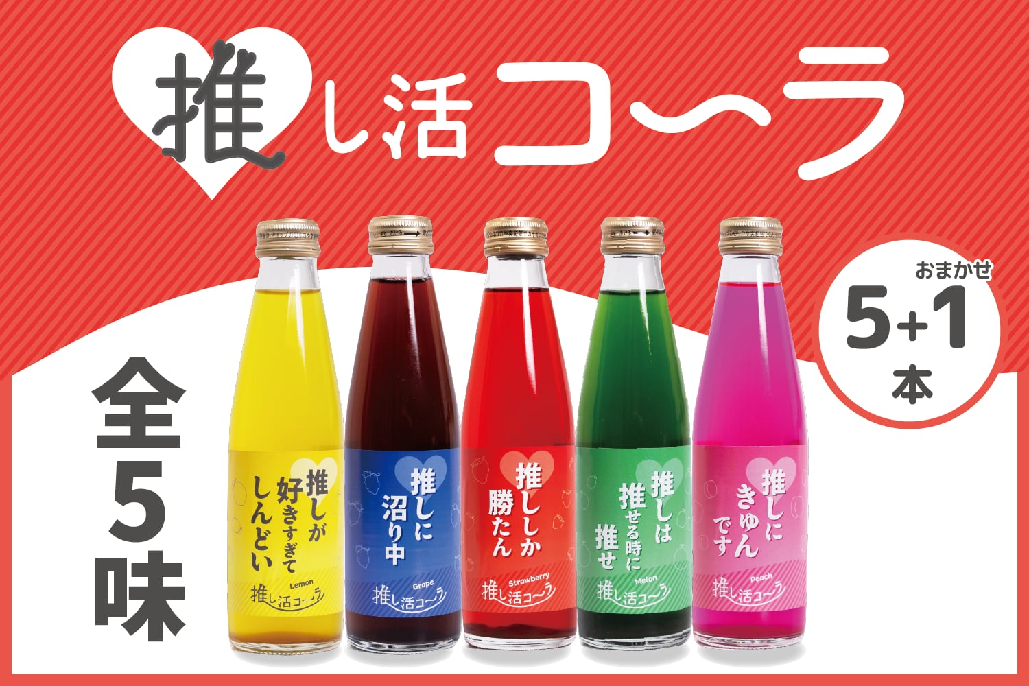 5種類( ストロベリーコーラ/グレープコーラ/レモンコーラ/メロンコーラ/ピーチコーラ)+ ランダム1本 の計6本セットです。